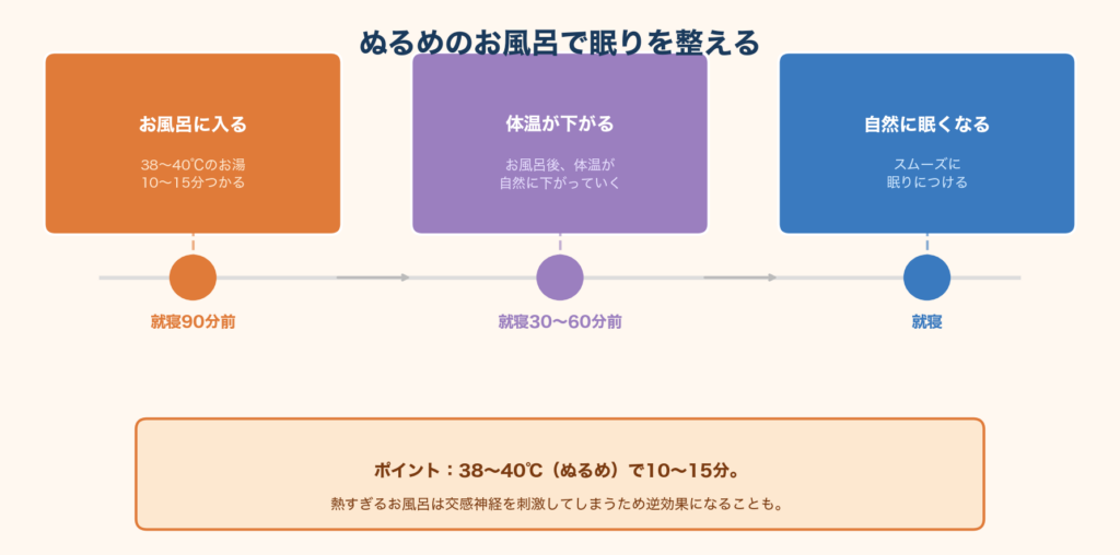 お風呂に入ると体温が一度上がり、その後体温が下がるときに眠気が訪れます。