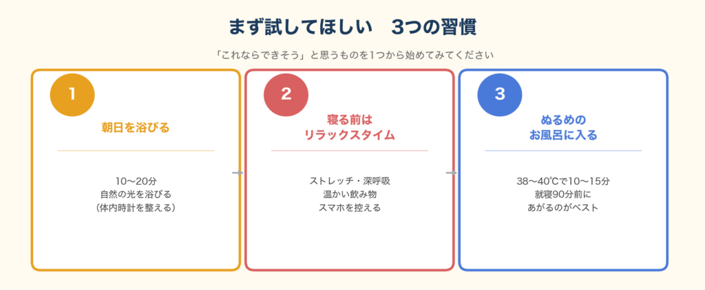 朝の光は体内時計を整える大切なスイッチです。朝10〜20分自然の光を浴びるだけで、夜の眠りが整いやすくなります。